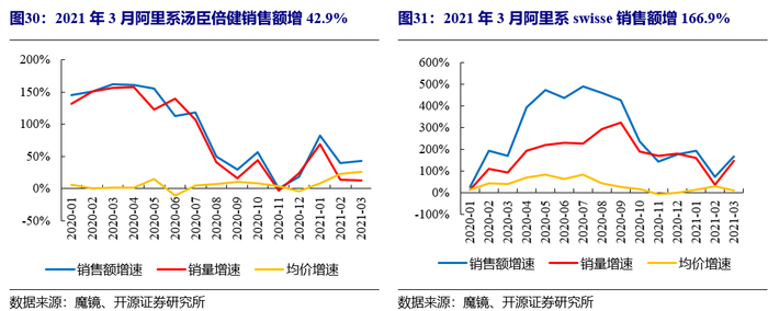 行业龙头销售额快速增长,量价齐升。根据魔镜数据,2021年3月汤臣倍健销售额达2.1亿元,同比增加42.9%,其中销量同比增13.2%,均价同比增长26.2%;swisse销售额达1862万元,同比增166.9%,其中销量同比增144.2%,均价同比增9.3%。膳食营养品行业龙头销售额高速增长,量价齐升。