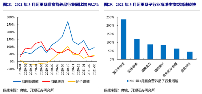 2021年3月普通膳食营养品行业快速增长,量价齐升。根据魔镜数据,2021年3月阿里系膳食营养品行业线上销售额达21.2亿元,同比增95.2%。拆分量价来看,销售量同比增38.3%,销售均价同比增41.2%,普通膳食营养品行业量价齐升。疫情以来,消费者健康意识提升,保健品消费升温,行业持续高速增长。分子行业来看,2021年3月海洋生物品类销售额增速最快,同比增236.9%;胶原蛋白行业线上销售额占比最高,达30.1%。