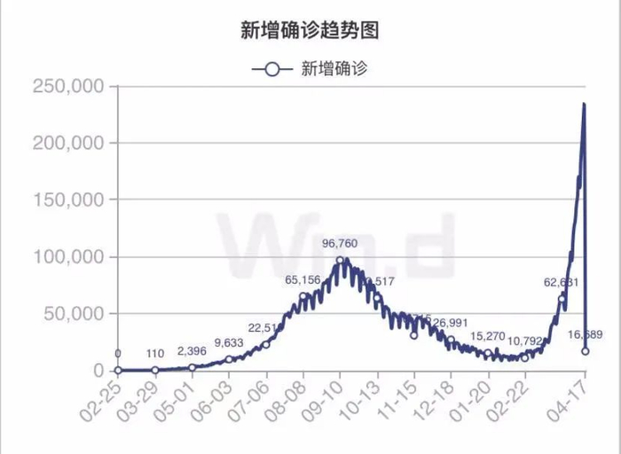 据印度卫生部公布的最新数据,截至当地时间4月17日8时,过去24小时内,印度新增新冠肺炎确诊病例234692例,累计确诊14526609例;新增死亡病例1341例,累计死亡175649例;累计治愈12671220例;现存确诊病例1679740例。