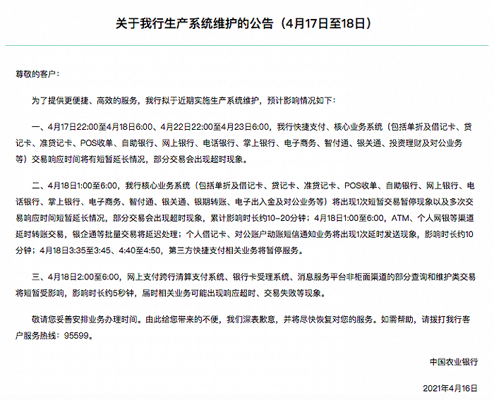 据悉,4月16日,中国农业银行在官网发布生产系统维护公告。