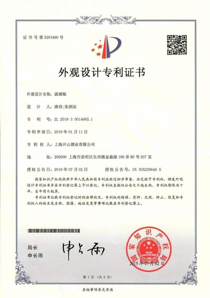 据开山酒业介绍,“开山酒瓶”具备创造性、独特性和辨识度,瓶底使用“昆仑山玉珠峰”立体造型;瓶身、瓶盖均为带有多条棱线的近圆柱型棱柱体;瓶颈部位收缩,瓶盖以类似塞子的效果固定在瓶颈上;瓶贴位于瓶身上部,紧邻瓶颈收缩起始点。