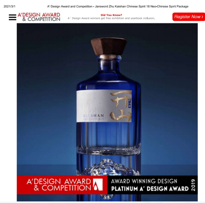 据介绍,开山的酒瓶设计已获得诸多奖项,如纽约Adobe Muse 铂金大奖、荷兰 Indigo 银奖、意大利A'Design Awards 铂金大奖。