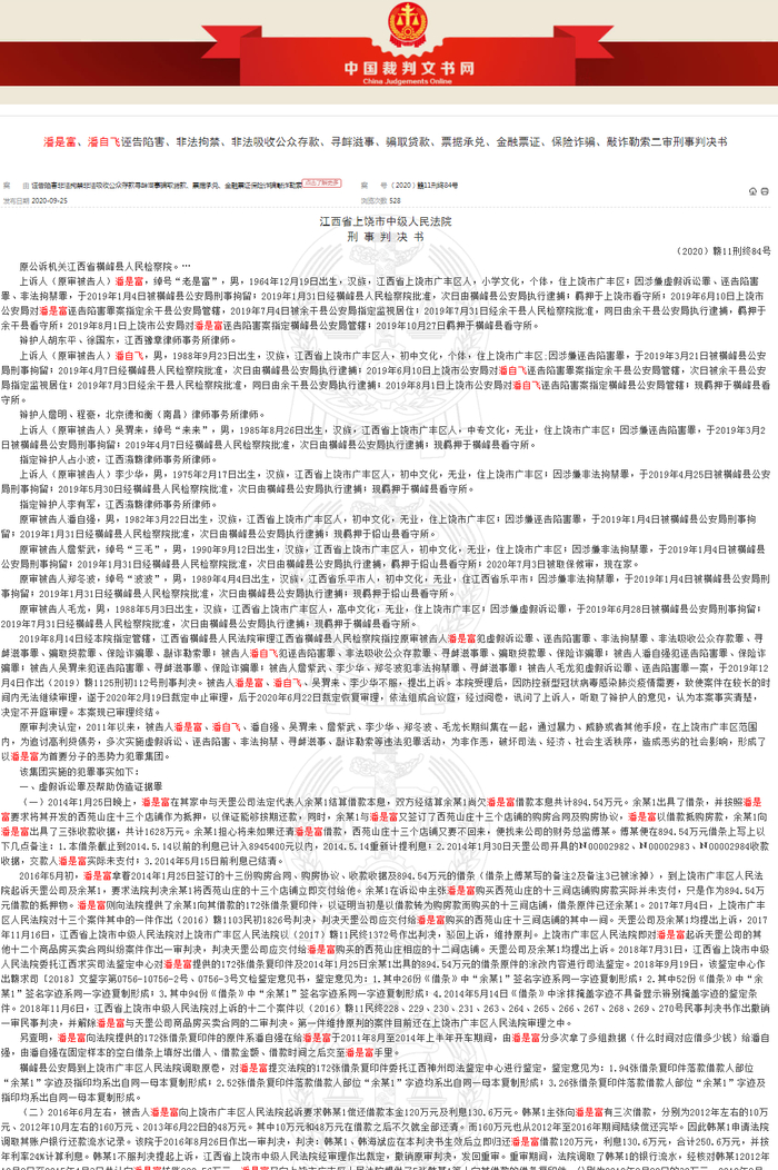 2020年7月7日,上饶市中院作出《潘是富、潘自飞诬告陷害、非法拘禁、非法吸收公众存款、寻衅滋事、骗取贷款、票据承兑、金融票证、保险诈骗、敲诈勒索二审刑事判决书》,其中,潘是富因犯虚假诉讼罪、诬告陷害罪、非法拘禁罪、非法吸收公众存款罪、寻衅滋事罪、骗取贷款罪、帮助伪造证据罪、敲诈勒索罪等多项罪名,被判处有期徒刑十八年,并处罚金人民币六十七万元;他的儿子潘自飞,也因犯诬告陷害罪、非法吸收公众存款罪、寻衅滋事罪、骗取贷款罪、妨害作证罪等多项罪名,被判处有期徒刑十年六个月,并处罚金人民币六十万元,该犯罪团伙的其他罪犯,也都分别被判刑。