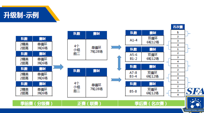 据悉,各年龄段队伍将参加定级赛、联赛和季后名次赛。以16支球队为例:各队先参照去年联赛成绩进行蛇形排列,分为4组进行小组循环赛,各组前2名共8支球队进入精英组,后8名球队进入提高组,再踢第二个大循环赛。接下来,精英组1-4,精英组5-6与提高组1-2,精英组7-8与提高组3-4,提高组5-8,共4个小组再分别进行循环赛。