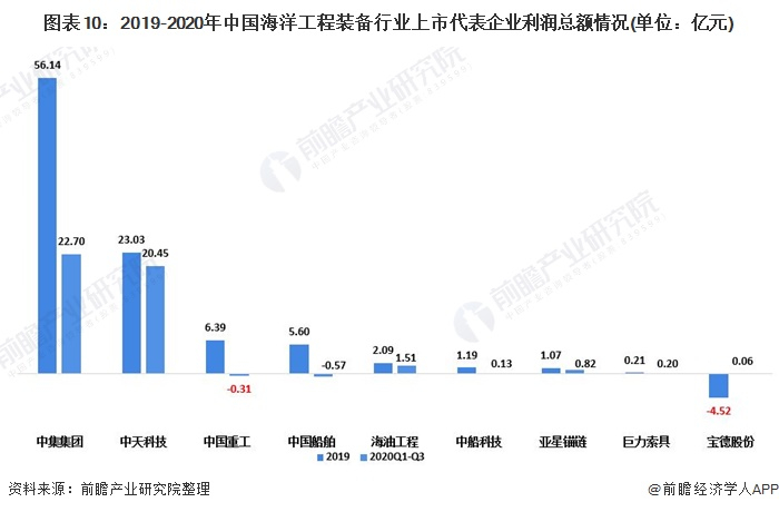 2019年我国海洋工程装备行业利润总额较高的企业主要有中集集团、中天科技、中国重工、中国船舶、海油工程。其中中集集团利润总额为56.14亿元,位居第一;中天科技利润总额为23.03亿元,中国重工利润总额为6.39亿元,中国船舶利润总额为5.60亿元,海油工程利润总额为2.09亿元。