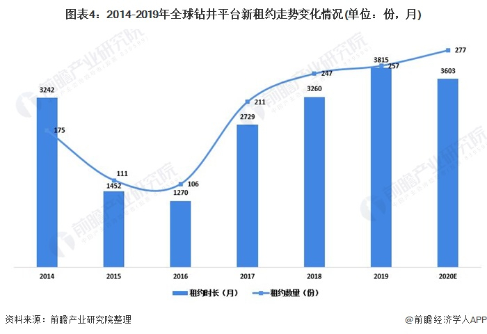 2019年全球海洋油气开发活动保持增长,带动海洋工程装备作业需求绝对量继续攀升。以钻井平台为例,2019年新租约达到257份,合计3815月,这是2017年以来连续三年保持增长,单份租约时长也从2016年不足12个月增至2019年的接近15个月。