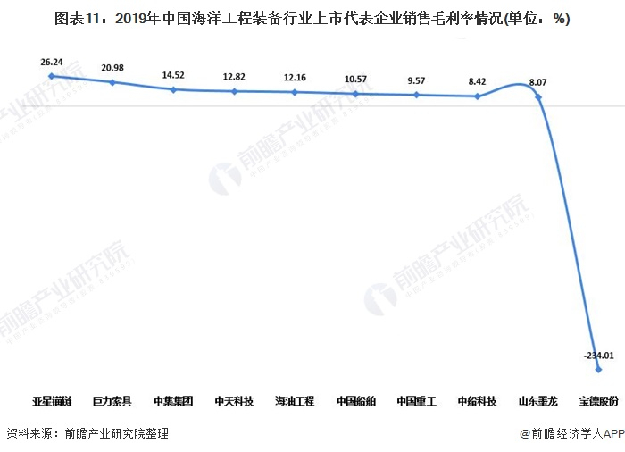 2019年我国海洋工程装备行业上市代表企业除宝德股份外,其余上市代表上市企业销售毛利率基本在8%-30%之间波动。其中亚星锚链销售毛利率为26.24%,为上市代表企业中最高。
