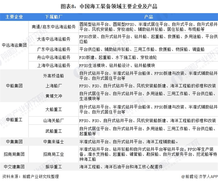 在我国企业竞争格局方面,我国海工装备领域主要企业分别为中远海运集团、中船集团、中船重工、中集集团、招商局集团和中交建集团。