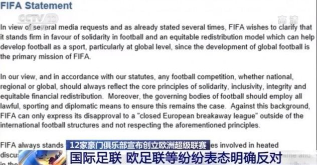 而就在18日,国际足联发表声明明确反对成立欧洲超级联赛。欧足联、以及英足总、英超联盟、西班牙足协、西甲联盟、意大利足协、意甲联盟也发布联合声明予以反对。声明指责欧洲超级联赛是建立在一些俱乐部自身利益基础上的封闭项目。所有参与的俱乐部将被禁止参加国内、欧洲以及世界比赛。他们的球员可能也将无法代表自己的国家队参加国际赛事。欧洲俱乐部协会也召开紧急会议,在随后发布的声明中表示对欧足联坚决支持。