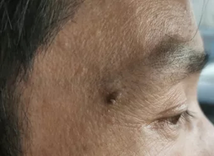 女,70岁,左胸上部深色突出,形状不规则,最大直径0.5厘米。不知什么时候长出来的,知道已有几年,今年好像比去年略大了。