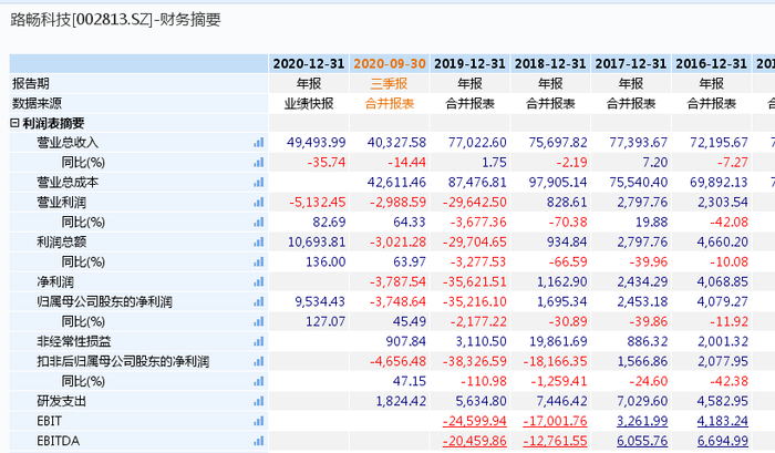 又如万安科技(002590.SZ)。截至19日收盘,该公司股价涨停,报7.81元。2018年~2020年前三季度,万安科技扣非后归母净利润均录得亏损。对比每年超20亿元的营业收入,该公司的研发投入常年不足1亿元。