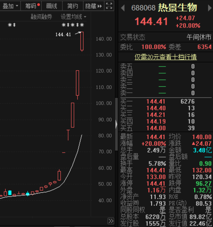 一季度净利同比预增超1000倍的热景生物(688068)4月19日再度涨停,报144.41元,股价再创历史新高。从上周至今,热景生物已经连续第五日涨停,五个交易日累计涨幅高达149%,市值89.22亿元。