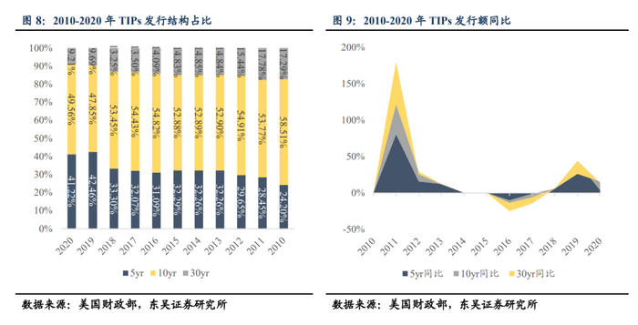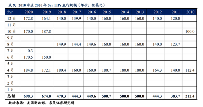 TIPs(Treasury inflation protected securities)作为除传统债券类型以外发行规模最多的债券类型,占据一级市场全年发行总额十年均值约 6.01%;TIPs 期限结构分别为5 年期、10 年期、30 年期,并按照一定规律穿插进月结构中,值得注意的是,不同期限的 TIPs 不会进行月频叠加。