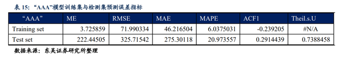 我们先使用加性“AAA”模型(Additive error、Additive trend、Additive seasonality)进行预测,并通过预测误差判断该模型的适用性。该模型平滑因子参数分别为α=0.0829、β=0.0829、γ=0.3684,下表中我们可以看到几种检验模型的参考数据,均方根差(Root-mean-square-error,简称为RMSE)衡量模型残差的误差程度,平均绝对误差(Mean absolute error,简称为MAE)可以反应检测集误差的真实情况,而平均绝对误差(Mean absolute percent error,简称为MAPE)相当于加权版MAE,使结果能更容易比较,可以看到此次“AAA”模型预测值误差为20.97%。