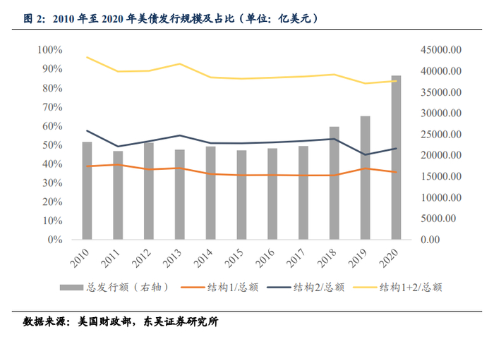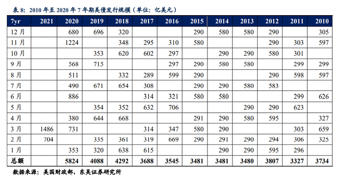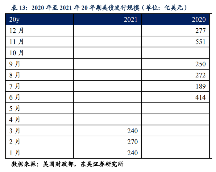 最后一种结构为20年期美债,财政部自2020年将该结构添加进一级市场发行框架中,我们认为这代表财政部在对长期美债期限结构进行调整。