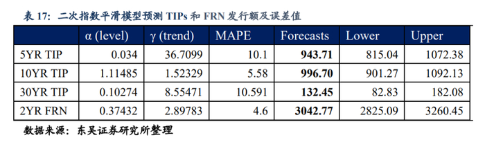 对于TIPs和FRN我们采用二次指数平滑模型,是因考虑到数据序列的非平稳性和非季节性;TIPs各期限结构的波动振幅缺乏一致性,因此我们分别代入进行计算,误差区间为5-11%(MAPE),5年期年发行额约为943.7亿美元,10年期年发行额约为996.7亿美元,30年期发行额约为132.45亿美元。同理带入2014年FRN自发行以来的数据进入模型,误差率为4.6%,预计年发行额为3042.8亿美元。