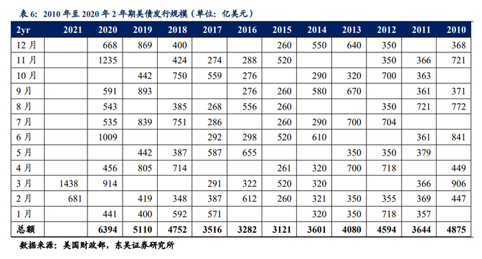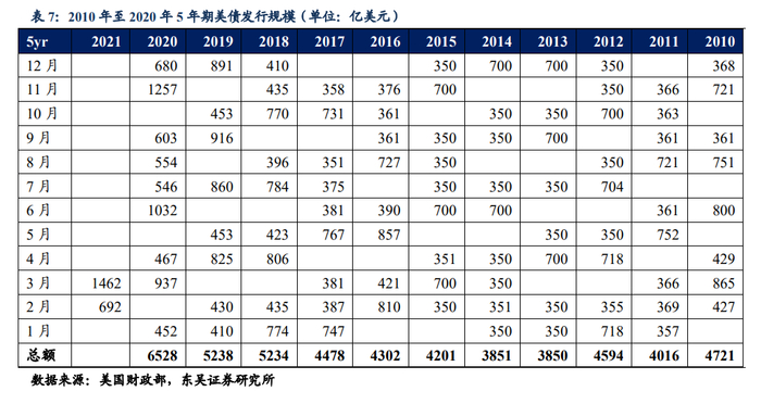 鉴于结构 2 非按月发行,并且年规模同比增长呈现平稳序列特征,我们取十年同比平均值 4.82%,预计 2021 年结构 2 发行总额约为 1.96 万亿美元,其中 2 年期美债发行总额约为 6484.37 亿美元,5 年期美债发行总额约为 7270.35 亿美元,7 年期美债发行总额约为 5894.88 亿美元。