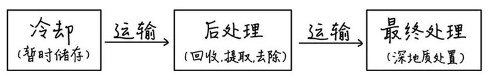 对于高级别的废料,它们一般来源于反应堆中的乏燃料,与中低级别的废料不同,我们不能挖个更深的坑将其填埋了事,从乏燃料的产生到最终填埋,中间还需要经过复杂的流程,历经数年的时间,但大致可以分为以下三个步骤: