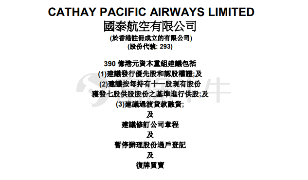 以此前宣布供股的$国泰航空(00293.HK)$为例,根据公司公告,按于供股记录日期每持有11股现有股份获发7股供股股份的基准,按供股认购价4.68港元进行供股2,503,355,631股供股股份,集资总金额为约117亿港元。
