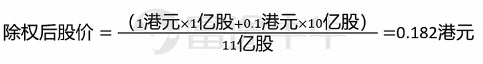 假设所有股东参与了供股,那么在除权日后,公司的股份会从1亿股变成11亿股(1亿旧股+10亿新供的股份)。理论上,除权后股价应该会变成0.182港元,比除权前的1港元暴跌82%。