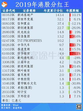 股息定义就是股票的利息,是指上市公司税后利润中按照股息率派发给股东的收益。2019年新鸿基地产年度累计分红高达143.4亿港元,成为当年港股分红王。