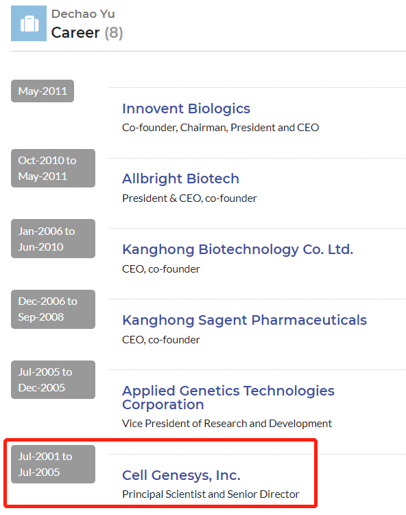 但在一个国外简历网站上,清晰地记载着:俞德超曾在2001-2005年任职于Cell Genesys公司,从高级研究员做到高级主管。