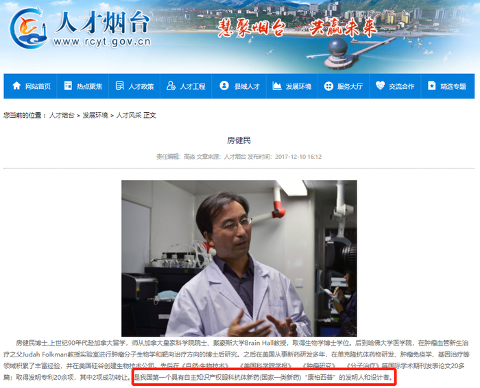 谜底在很多年后才被揭开。随着山东荣昌生物逐渐声名鹊起,其创始人房健民的宣传声浪也逐渐增大。大约在2017年前后,包括烟台官方网站在内,都宣传房健民是“康柏西普”的发明人和设计人。