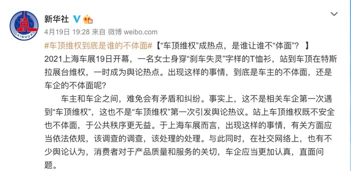 新华社官方微博19日晚间发布文章称,2021上海车展19日开幕,一名女士身穿“刹车失灵”字样的T恤衫,站到车顶在特斯拉展台维权,一时成为舆论热点。出现这样的事情,到底是车主的不体面,还是车企的不体面呢?
