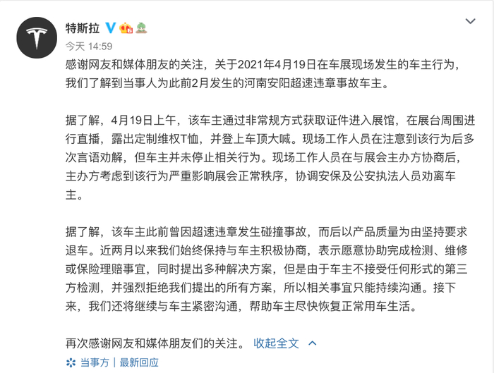 19日下午,特斯拉官方发布微博称:“关于今日在车展现场发生的车主非理性行为,我们了解到当事人为此前2月发生的河南安阳超速违章事故车主。”而据当地媒体报道,针对特斯拉在上海车展遭遇的维权事件,上海警方已介入调查。
