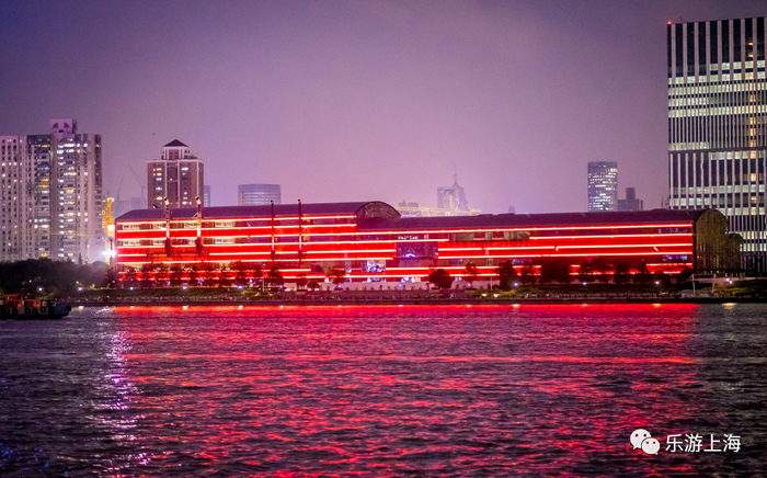 剧院的灯光在江面上形成一片红色的光影,犹如一幅绝妙的油画,不愧为浦江畔又一灿烂文化艺术明珠。