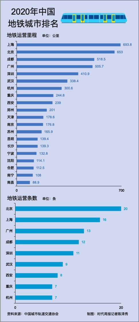 从具体城市看,2020年共有11座城市地铁日均客流量超过100万,比2019年减少2座。