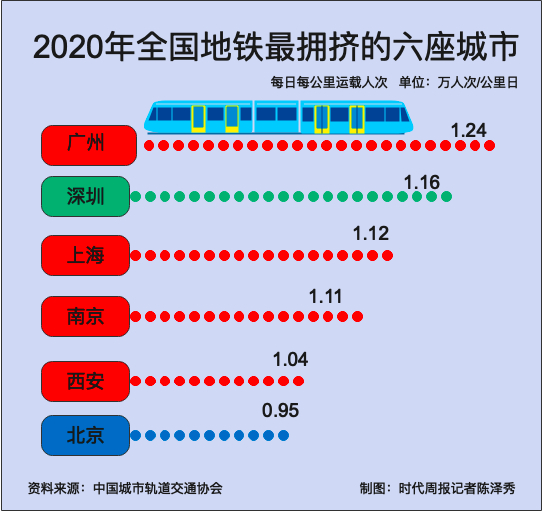 与客流量相比,客运强度更能反映地铁的拥挤程度。2020年哪个城市地铁最拥挤?答案是广州。