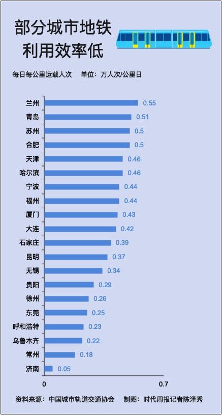 相比于一二线城市的繁忙,也有城市出现地铁利用效率较低的情况。