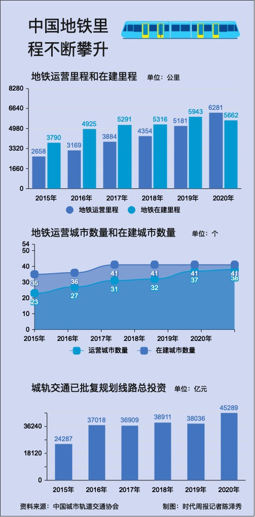时代周报记者对比2015年的报告发现,过去五年间,国内开通地铁的城市已从23个增加至38个,运营里程从2658公里提高到6280.8公里,翻了两倍有余。
