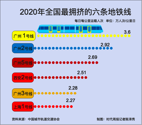 从单线来看,全国最拥挤的六条地铁中,广州占四条。