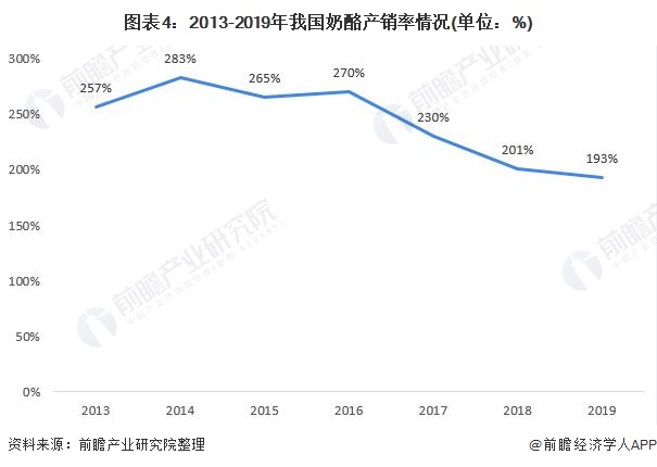从行业整体供需情况来看,我国奶酪市场目前处于供不应求的状况,但随着我国奶酪产能的逐步提升,产能不足情况将会得到缓解。2013-2019年,我国奶酪产销率整体呈现波动下降的情况,2019年我国奶酪市场产销率为193%,较2018年下降7个百分点。