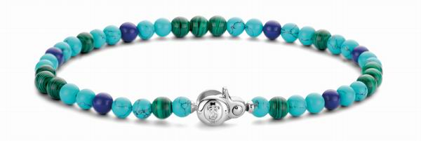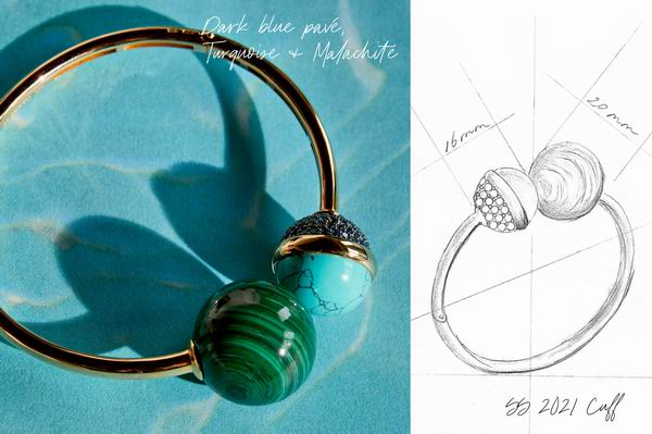 充满能量的海洋蓝色调来自于“Radiate Love”系列之“沐浴阳光”,标志性设计是受阳光光线所启发的拼接吊坠,青松绿、静谧蓝和孔雀绿在圆盘上交相辉映,迸发出万丈光芒。还有太阳形状、辣椒形状的金色吊坠,以及象征和平的爱心,都十分温暖。蓝绿圆石镀金袖口手镯和项链绝对是时尚必备单品,由金色分割的蓝绿宝石让人想起蔚蓝的天空与碧绿的海水在远方交汇。