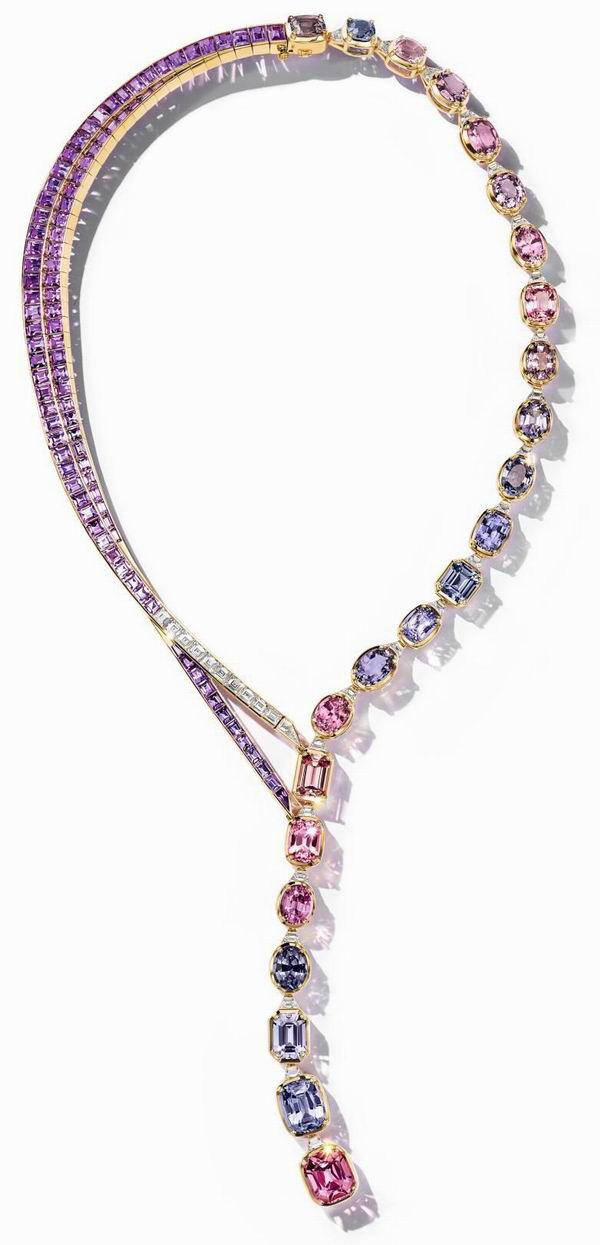 18K黄金镶嵌混合切割蓝色、紫色及粉色尖晶石,狭长形紫色蓝宝石及混合切割钻石项链,