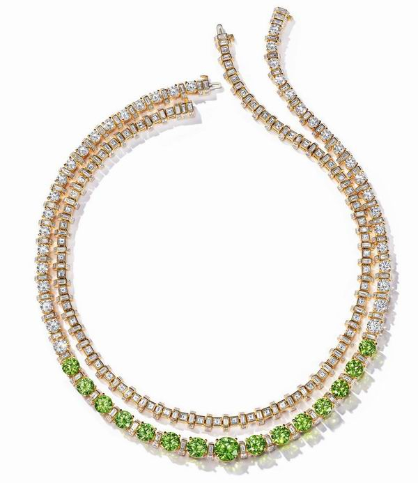 2021年,蒂芙尼以细腻视角探索世间瑰丽,发布全新2021 Blue Book 高级珠宝系列 Colors of Nature 作品,开启一段意趣盎然的迷人之旅。从广袤大地,到瀚海星辰,自然孕育万般色彩,描绘千种旖旎。蒂芙尼从大自然汲取灵感,汇聚蒂芙尼高级珠宝的非凡设计与让·史隆伯杰(Jean Schlumberger)的匠心之作,呈现无垠绮境(Land)、瀚海千姿(Sea)、造物本色(Earth)、苍穹流光(Sky)四大主题,以多彩宝石探索高级珠宝的无限可能。无垠陆地,承载万物生灵,凝聚无穷色彩。于蒂芙尼而言,无论是流露盎然之意的丰沛绿植,还是迸发饱满之色的精巧浆果,皆是这片陆地别具一格的艺术呈现。蒂芙尼沉醉于一草一木的生动绚丽,以卓越艺术远见再现这片广袤而又多姿的世界。这款简约精致的18K黄金项链,在俄罗斯翠榴石与混合切割钻石的辉映下,一展青翠欲滴的悦动光芒,令人不禁联想到柔和春日下的如茵碧草,清新明媚。独特的双股式设计,赋予项链多变造型。