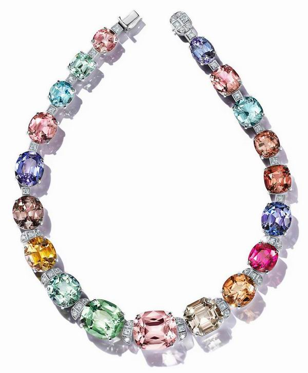 铂金镶嵌椭圆形及枕形切割粉色碧玺、坦桑石、海蓝宝石,混合切割橙色碧玺,枕形切割绿色碧玺、摩根石、红碧玺,公主方形切割及圆形明亮式切割钻石项链,来自Tiffany & Co. 蒂芙尼 2021 Blue Book 高级珠宝系列 Colors of Nature。