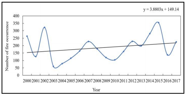2000~2017年蒙古野火数量变化趋势 / Nasanbat, et al, 2018