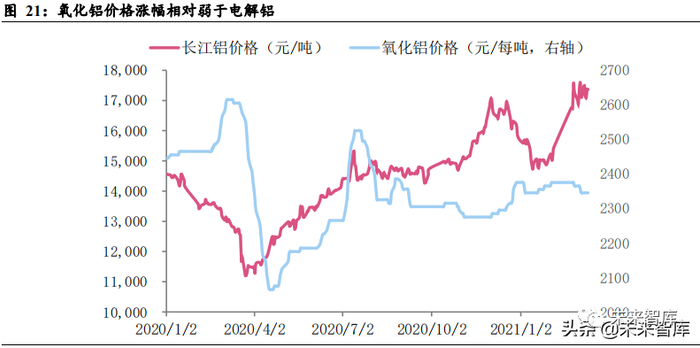 高耗能行业优惠电价逐步取消,火电铝成本优势大幅减弱。2017 年下半年至 2019 年中,由于下游需求偏弱导致铝价长期低位运行,叠加上游原料价格居高不下及电 价,电解铝行业长期处于亏损状态,在此背景下,各地方政府为保护本地企业发展 相继出台电价优惠政策。而随着 2020 年以来,行业盈利不断走高,以及国家对环保 越发重视,各地区竞相调整电价政策,尤其是甘肃、内蒙古、青海等以煤电为主的 省份纷纷明确自 2021 年起表示不再执行电解铝行业优待电价政策,调整幅度普遍 在 0.05 元/kWh 左右,导致吨铝电力成本较预期提升 700 元左右。
