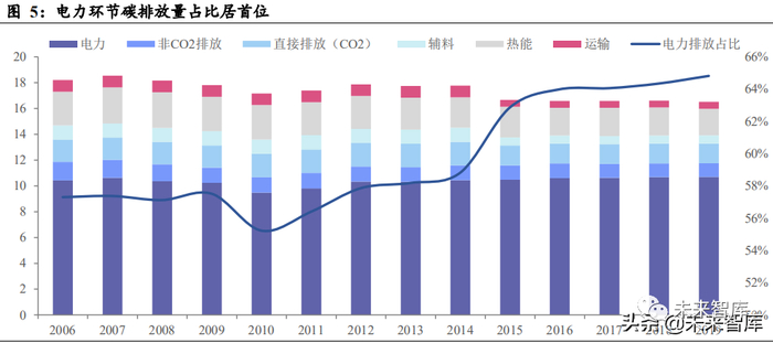 电力环节是电解铝产业链主要碳排放量来源。据 IAI 数据,2019 年单吨电解铝碳排 放结构中,电力环节排放量约 10.7 吨,占比 64.8%,居首位;其次是热能和生产过 程中的直接排放,分别为 2.1、1.5 吨,占比 12.5%、9.3%;非 CO2排放 1.1 吨(6.4%), 辅料排放 0.6 吨(3.8%),运输过程中排放 0.5 吨(3.2%)。即便如此,电解法仍是 现在全球工业生产原铝的唯一工艺,并且近 15 年电解环节的碳排放量占比不断提 升,从 2006 年的 57%上升到 2019 年的 65%。