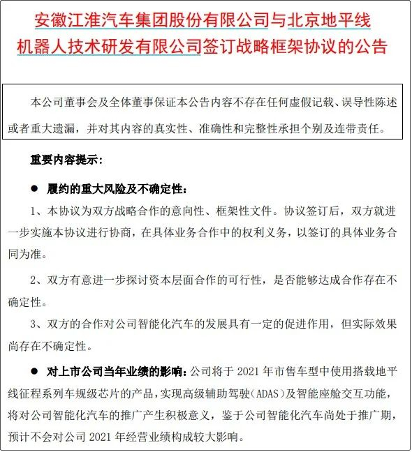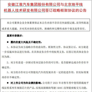 4月19日晚间,江淮汽车发布公告称,公司与北京地平线机器人技术研发有限公司(简称“地平线”)签订战略框架协议,将推动双方在汽车智能驾驶、智能网联、人工智能领域推动深层合作。