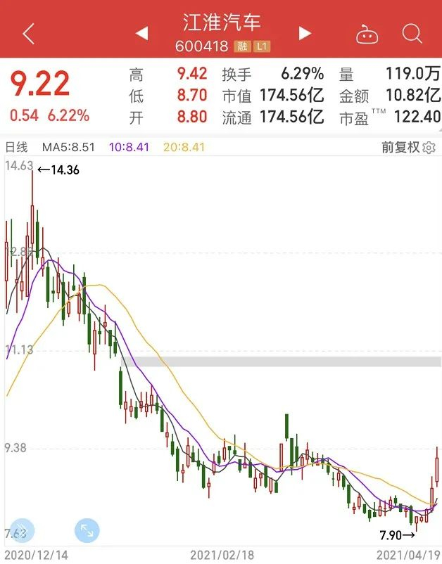 股价方面,江淮汽车自2020年年底触及14.36元的阶段性高位后便一路下跌,截至4月19日,江淮汽车股价报9.22元,期间跌幅接近30%。