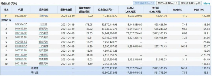 400多亿元的营业收入,却只有1.43亿元的净利润,让江淮汽车净利润率远低于同行,更是远远低于56.17亿元的行业前10名的平均值,而其122.4倍的动态市盈率水平却远高于同业水平。
