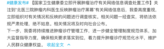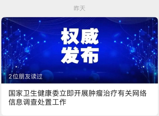 昨日(4月19日)微信公众号“健康中国”发布《国家卫生健康委立即开展肿瘤治疗有关网络信息调查处置工作》,正式回应卫健委将对肿瘤治疗黑幕展开调查,结果将及时公布!