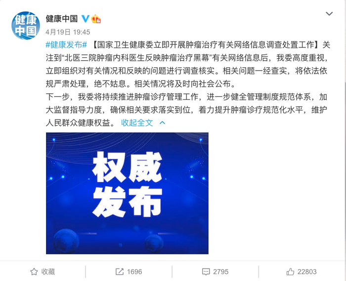 4月19日晚间,国家卫健委对此回应称,关注到“北医三院肿瘤内科医生反映肿瘤治疗黑幕”有关网络信息,立即组织对有关情况和反映的问题进行调查核实,绝不姑息。