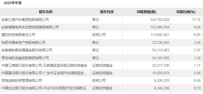 值得一提的是,本次非公开发行对象为江淮汽车的控股股东安徽江淮汽车集团控股有限公司(简称“江汽控股”)。截至2020年12月31日,江汽控股持有公司32470.30万股,持股比例为17.15%。本次发行的股票将由发行对象全部以现金方式认购。