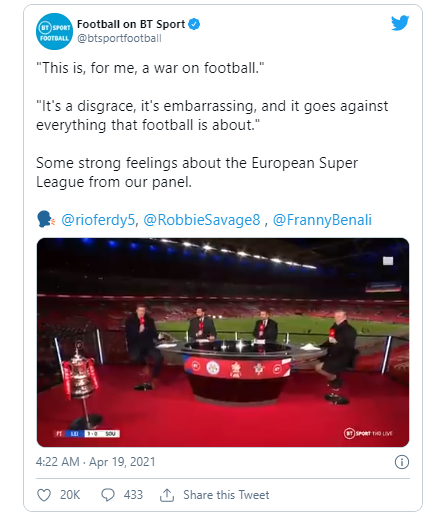 曾效力于曼联的前球员里奥·费迪南德则称这是一场 “足球战争”,还说“这是耻辱,这很尴尬,这与足球所代表的一切背道而驰”。
